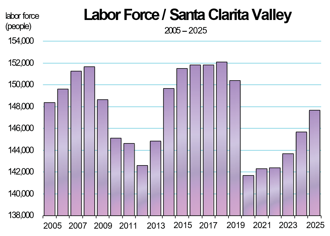 The labor force in the Greater Santa Clarita Valley area, which includes the surrounding communities of Agua Dulce, Val Verde, Castaic, Stevenson Ranch, and Canyon Country, is now estimated at nearly 150,000. The labor force is the number of residents who are either working or want to be working. After the post-pandemic surge of the previous years, 2025 brought a slight leveling off in total employment among the SCV’s largest organizations. Collectively, the top employers reported a minor net contraction, essentially holding steady amid more than 31,323 positions out of the estimated 97,192 total local jobs in SCV. 19 of the top 50 private companies on the list expanded their workforce this year, and many others held steady. The slight dip in the largest-firm employment should be viewed in context: Santa Clarita’s labor market is essentially at full employment, and job growth is naturally tempering after the rapid gains of recent years. In other words, the Valley’s employment base remains robust and near–record highs, a testament to the strong recovery and expansion we’ve experienced since the pandemic shock.